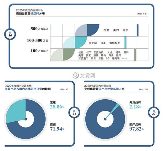 由此也可以說明,即便是沒有產業政策,變頻空調在國內市場也處于一個持續上升的通道之中,新能效標準的實施只是加速了變頻空調再普及。2020年度5960萬套的變頻空調出貨量,在行業總出貨量中的比重達到了71.94%。正如出貨量以逆市上揚之勢創下歷史新高一樣,這一占比同樣達到了一個歷史性的峰值。值得一提的是,過去十年中,哪怕是出貨規模出現下滑的2015年,變頻空調出貨量占比都保持著增長。(圖32、圖33、圖34、圖35)
