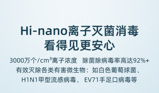 凈風(fēng),納米荷葉疏濾網(wǎng),國家專利技術(shù)(專利公開號:CN110079016A),更高效防塵、更易清洗,高效抗菌(金黃色葡萄球菌、大腸桿菌抗菌率達到99.99%。),高效去除PM2.5(對PM2.5去除率高達80.53%);凈機,57℃高溫烘干自清潔,湛藍抑菌翅片,大腸桿菌、金黃葡萄球菌,抗菌性達99.99%以上;防霉等級為0級(最高級);且為內(nèi)外機雙清潔,用戶可自由選擇,拒絕多耗電能;凈環(huán)境, Hi-nano離子滅菌,清新空氣(3000萬個/cm3),除塵、除污染除菌殺病毒(白色葡萄球菌去除率可達99%以上,對H1N1甲型流感病毒、EV71手足口病毒1h去除率99.99% )