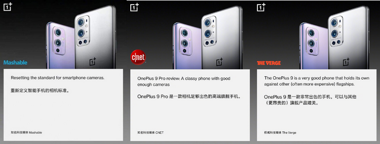 銷量走高的背后是市場對一加 9 系列產品實力的認可。一加 9 系列發布后,收獲了國外多家科技媒體的高度評價。知名科技媒體 Mashable評價:重新定義智能手機的相機標準;CNET則指出:OnePlus 9 Pro是一款相機足夠出色的高端旗艦手機;權威科技媒體 The Verge更是直接稱OnePlus 9 是一款非常出色的手機,可以與其他(更昂貴)旗艦產品媲美。