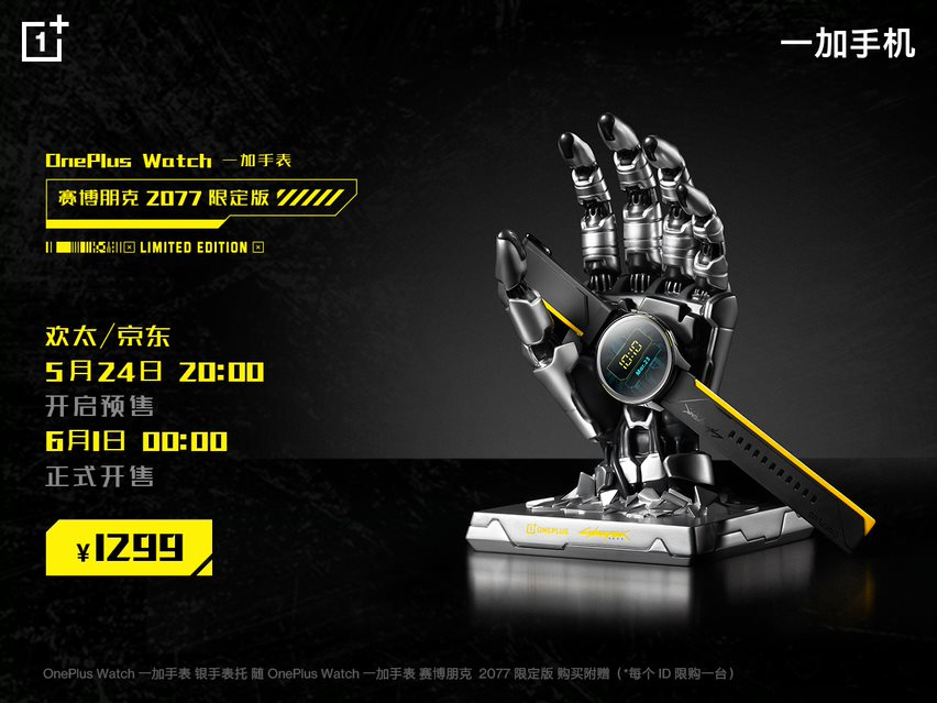 OnePlus Watch 賽博朋克 2077 限定版已于歡太商城、京東商城開啟預約,定價1299元,6月1日正式開售,更多資訊敬請關注一加官方信息。