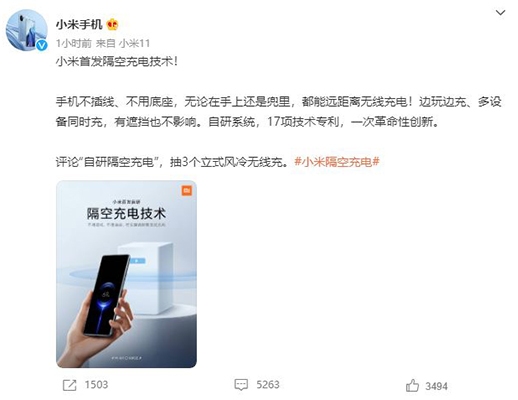 - 小米首發隔空充電技術 支持5瓦遠距離充電