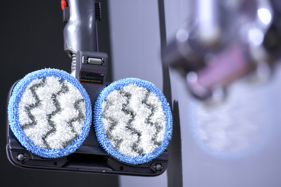 小狗T12 Plus Rinse擦地吸塵器的核心看點之一就是其配備的旋轉擦地刷,這款刷頭的吸口為前置設計,推動過程中先吸凈地面的灰塵毛發,隔絕清潔布接觸灰塵等臟污,進而減少換洗清潔布的次數。刷頭底部采用雙轉盤外旋式設計,轉速為220轉/分鐘,旋轉時產生前進助力,使用更省力,輕松擦掉地面頑固污漬。旋轉擦地刷還搭載獨立電機控制出水量,設置三個檔位進行出水調節,保持清潔布在擦地時處于適宜的濕潤狀態。另外,在清潔布的選擇上小狗吸塵器也很用心,采用三層復合設計及捻布工藝,用料厚實,鎖水鎖灰且強力去污,擦地更干凈。