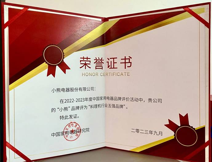中國家用電器品牌評選出爐:小熊電器獲“料理機行業(yè)五強品牌”