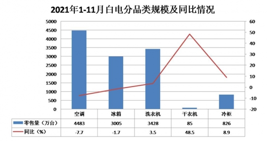 【家電資訊-家電資訊 - 洗衣機(jī),作者:編輯】2021年1-11月洗衣機(jī)零售量約3428萬臺,同比微幅增長,和一些新興品類相比,增長疲態(tài)已現(xiàn)。
