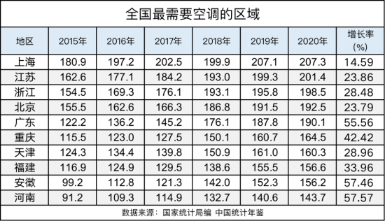 但空調擁有量數據和區域天氣有關,下面我們從需要的層面來看數據,先來看看那些區域最需要空調,從數據上來看上海早在2015年就已平均百戶居民擁有180.9臺空調領跑全國,2020年上海已到平均每戶居民安裝2.07臺空調,當選全國最需要空調的區域NO.1,最需要空調的地方居然不是廣東?不知道上海居民是不是也和廣東居民一樣認為,到了夏天命都是空調給的?