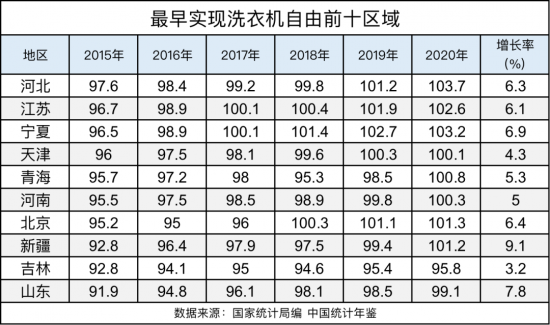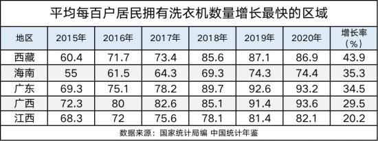 從增長率看,洗衣機擁有量增長最多的區域是西藏,2015年西藏每十戶居民平均只擁有6.04臺洗衣機,到2020年增加至8.69臺洗衣機,增長率為43.9%。讓人意外的是廣東這個經濟比較發達的區域,在2015年平均每十戶擁有洗衣機量只有6.93臺,與西藏差別并不大。