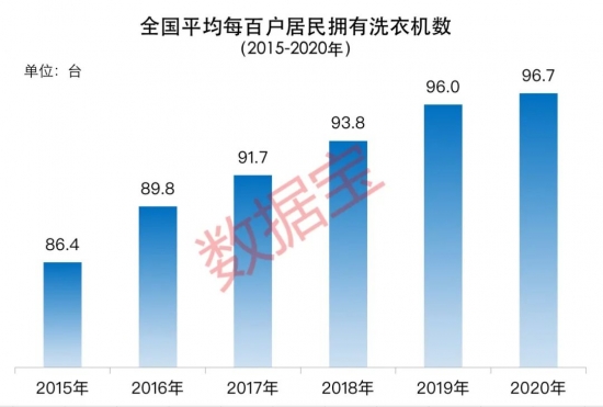 搓澡完畢該洗衣,從2015~2020年全國居民平均每百戶年末擁有洗衣機的數據來看,人均一臺洗衣機是基本實現的畫面。