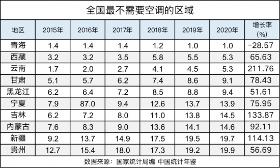 既然有最需要空調的地方,當然也有最不care空調的地方了。青海由于海拔和地理位置原因導致冬季寒冷漫長,夏季涼爽短暫。空調擁有量從2015年到2020年居然呈現了負增長率-28.57%。榮獲最不care空調的區域榜首。