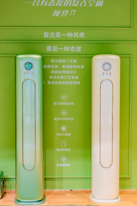 當現代科技遇上復古美學,會碰撞出怎樣的火花?格力摩登π柜機給了我們一個完美的答案。復古是一種風格也是一種態度,格力摩登π柜機擁有復古綠和若華金兩種顏色,超高顏值,自帶極致電影氛圍感。機身上的仿時光表盤顯示屏和金屬感旋鈕,每一處細節都透露出對過去的懷念與致敬。