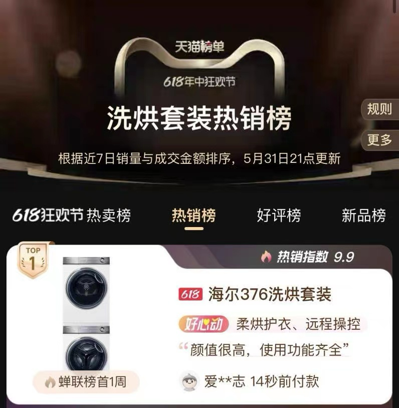 據最新數據顯示,截至5月31日21時,在京東渠道,海爾云溪系列洗衣機位居行業高端份額TOP1;在天貓渠道,海爾376洗烘套裝占據天貓熱銷榜單TOP1。