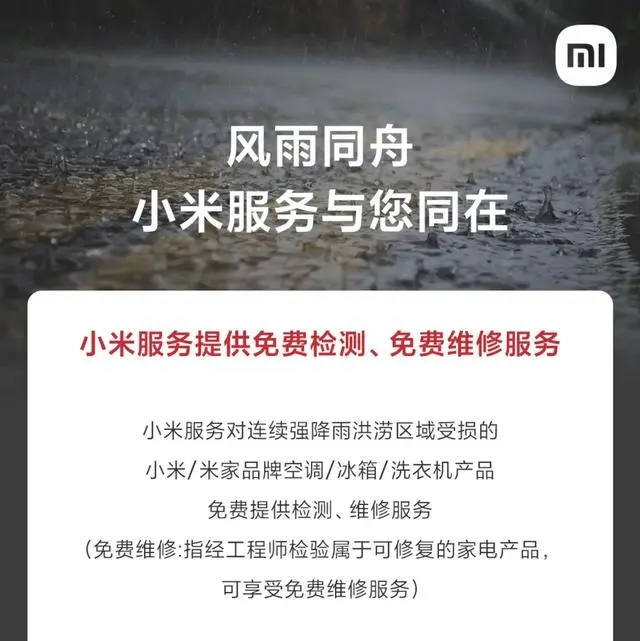 - 7 月 22 日消息,小米服務今日宣布,對連續強降雨洪澇區域受損的小米 / 米家品牌空調 / 冰箱 / 洗衣機產品,免費提供檢測、維修服務(經工程師檢驗屬于可修復的家電產品,可享受免費維修服務)。