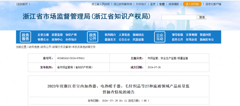 - 浙江省市場監督管理局對室內加熱器、電熱暖手器、毛針織品等27種產品在流通領域開展質量監督抽查。現將抽查情況通報如下: 一、基本情況 本次共抽查流通領域1276批次產品,檢出291批